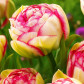 Tulipa double late 'Double Touch' — надзвичайно декоративний сорт із великими густомахровими квітами. Білі пелюстки з рожевим обрамленням виглядають елегантно та романтично, створюючи атмосферу ніжності й урочистості. Цей сорт поєднує красу троянд і півоній, але при цьому залишається класичним весняним тюльпаном.