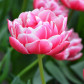 Tulipa 'Columbus' — це вражаючий ранній махровий тюльпан, який поєднує в собі насичене малиново-рожеве забарвлення з кремовими краями пелюсток та багатошаровою півонієподібною формою квітки. Його пелюстки створюють ефектний акцент у будь-якому саду.